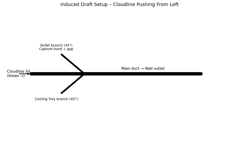 It’s the same principle used in industrial induction hoods: push clean air → indirectly pull the smoke. With a powerful inline fan, such as a Cloudline, this should work pretty well with 100 mm (4”) duct runs.