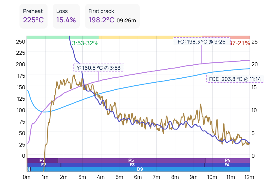 HIs 1kg being: 300C Preheat, Charge P9, D9, F3 → 150C P7 → 190C P5 for a 9 min ish first crack and an AG75 drop at 3 minutes of development.