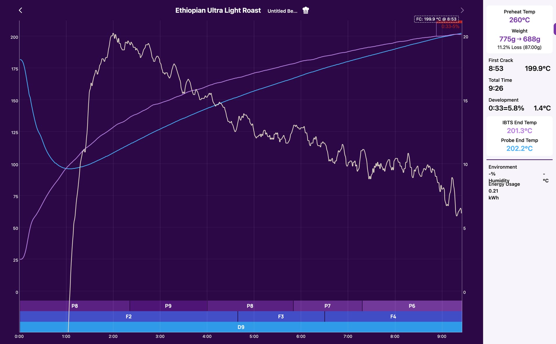 The P settings in the roast profile for my Ethiopians typically looks like P8 > P9 > P8 > P7 > P6 for the last couple of minutes. I don’t adjust drum speed at all but use F settings to manage RoR