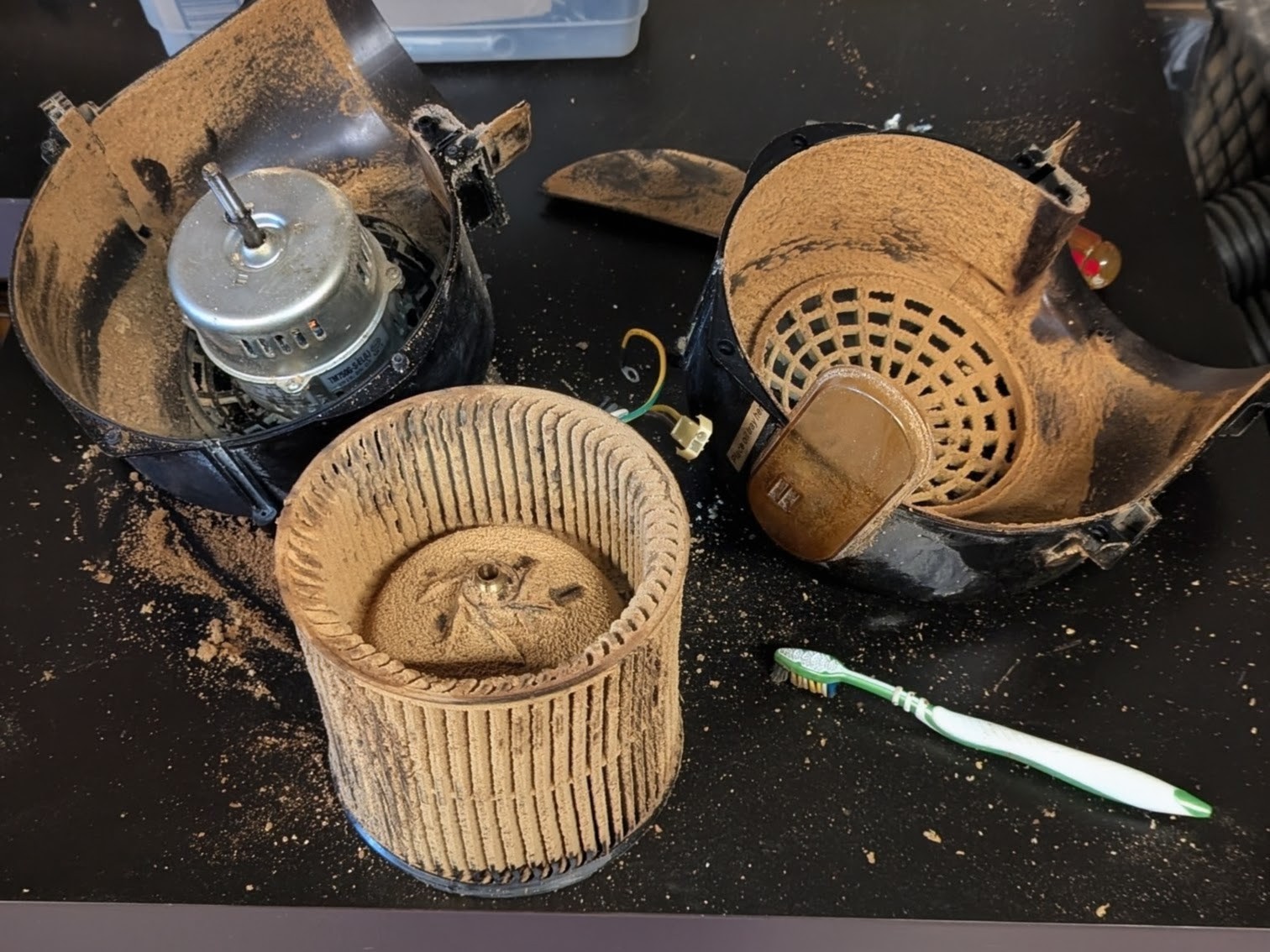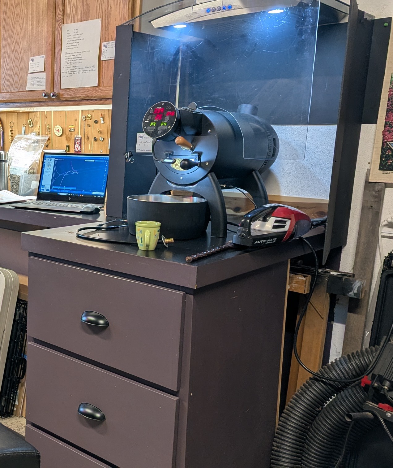 My overhead exhaust hood starting making a serious noise at high speeds after 390 medium to light roasts, I decided to take apart the encased blower unit and discovered a complete caking of coffee dust clogging the air flow of the blower blades. After a complete cleaning it is back to working properly. The exhaust uses baffle type filters which evidently don’t collect all the particles flowing out of the Bullet during roasting. I will have to add this cleaning task to my maintenance schedule.