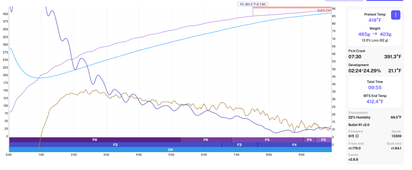 Based on these observations, I believe your preheat is too low and your drum temp is too high. (see recipe suggestion in postscript)