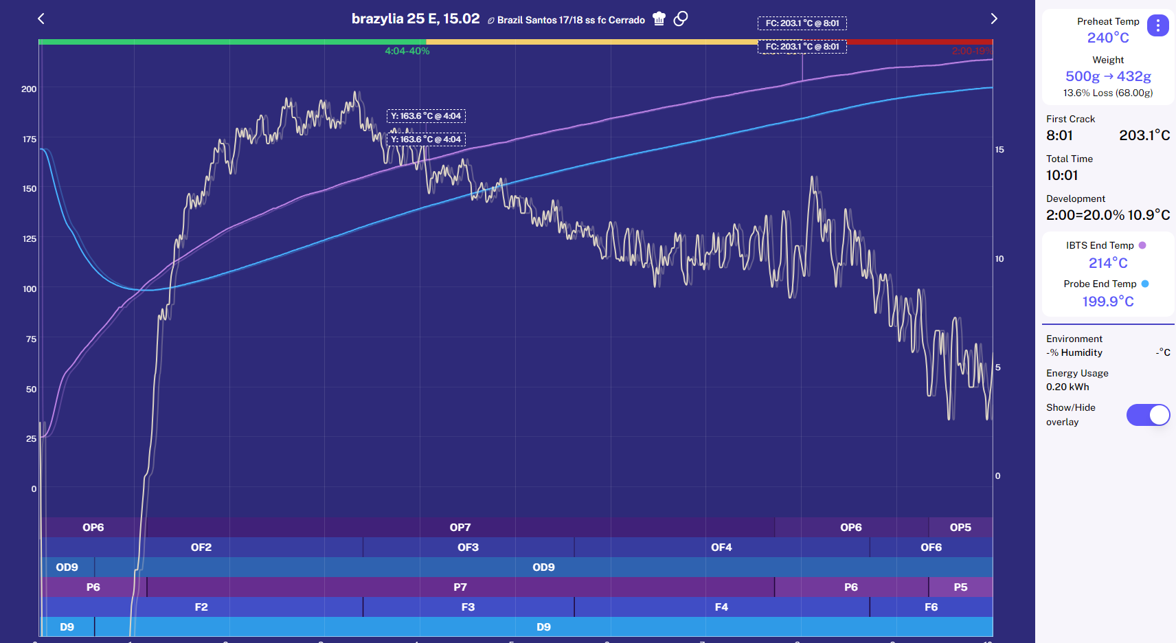 For this coffee, first crack (FC) happens at around 203°C.