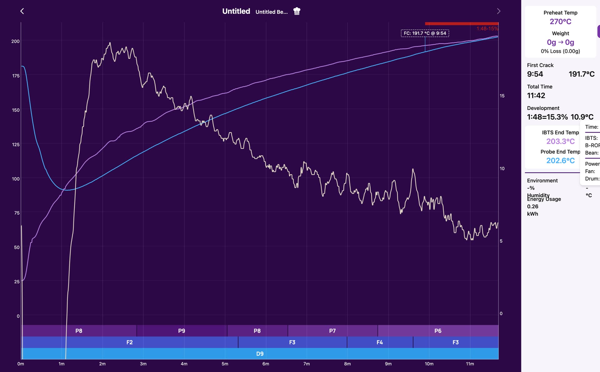 Forgot to say that you’ll need to adapt a great deal. It did seem odd that your PH is just at 270°C for a 775g batch. Preheating to that temperature, you should be around 187°C on BT at the start of the roast, but you’re starting at 205°C. That would be more of a 285-290°C PH. So, keep in mind that you’ll need to up the PH and adjust your roasting routine once the sensor is clean. Why do it then? Well, because it’s never a good thing when something as hot as that goes 10-15°C over set temperature without you knowing it. On max PH, which I think is 310°C, the machine would probably give an error and go into cooling mode, because you’d overshoot the set temperature.