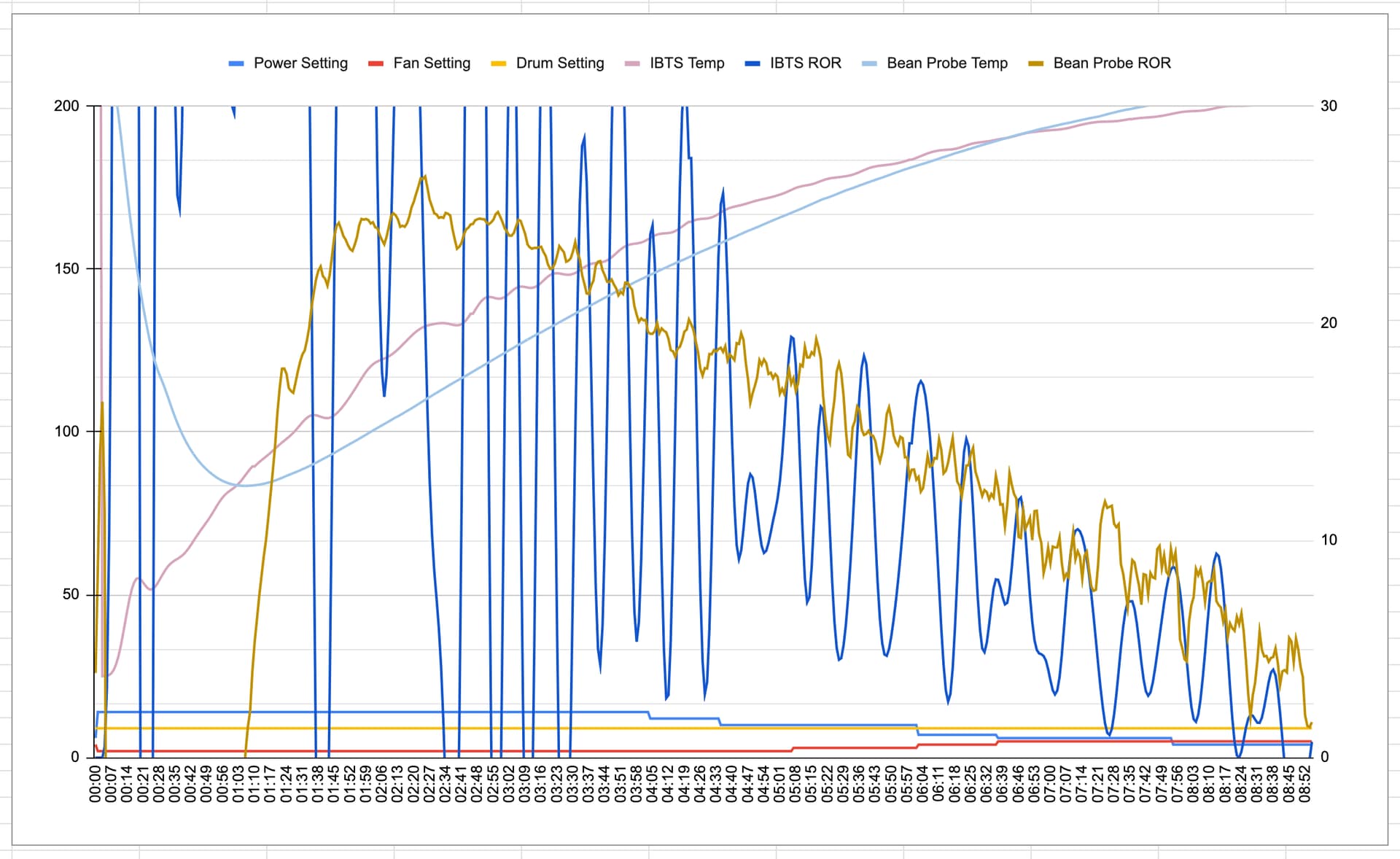 The CSV file with all of the roast data doesn’t seem to match the data shown in RoasTime. This is a sample from one roast at the 1min mark. RoasTime shows an IBTS temp of 84.2ºC and I-ROR of 51.8ºC/m, whereas the CSV shows 82.38ºC and I-ROR of 30.04ºC/m. The bean temp/ROR is also off.