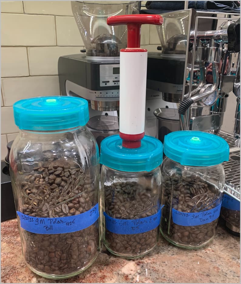 I’ve been using this method since you first mentioned it with my assortment of 8 or 9 beans I have at any one time as my daily drinkers. I will pour out a small jar’s worth at a time in between vacuuming down. Works great and really keeps them fresh!